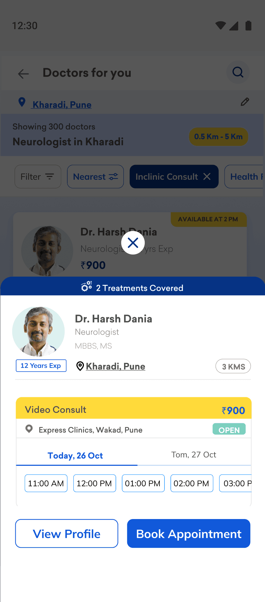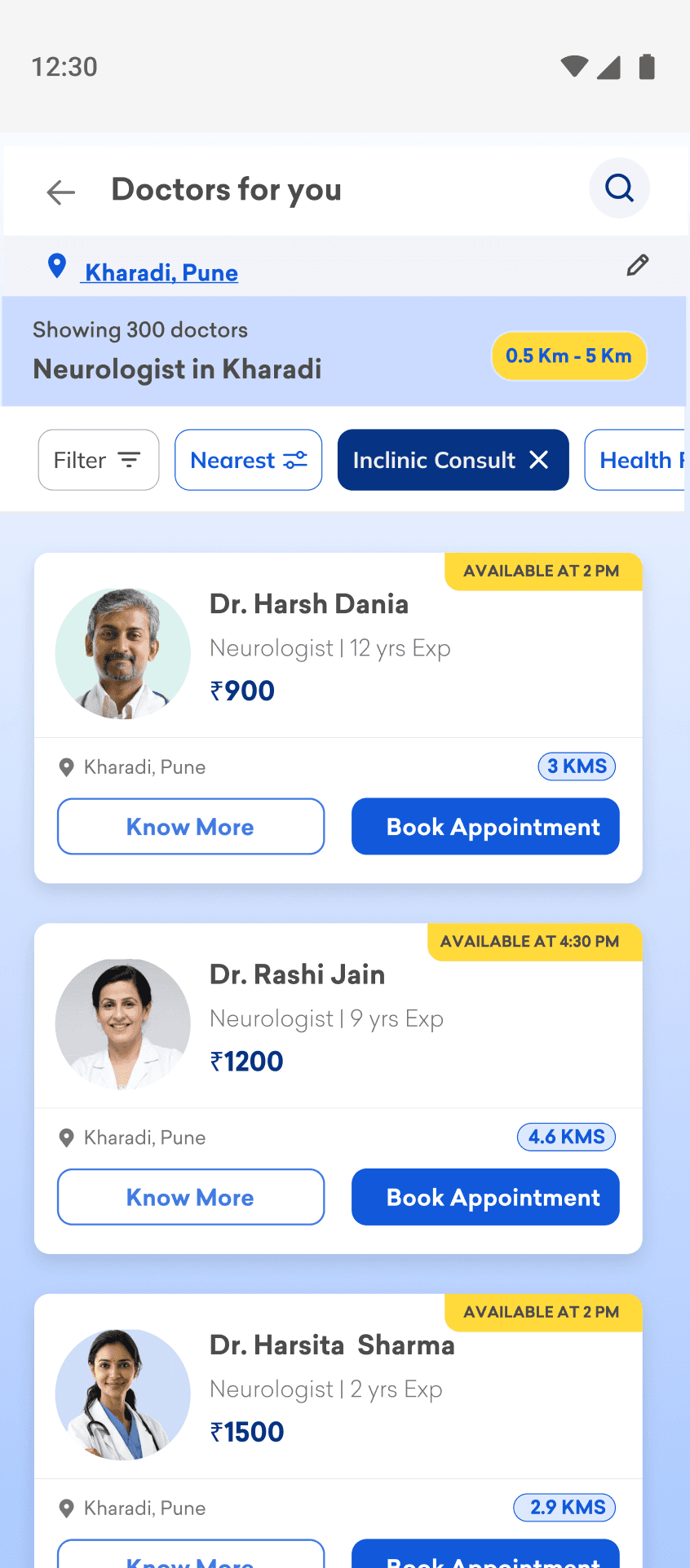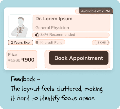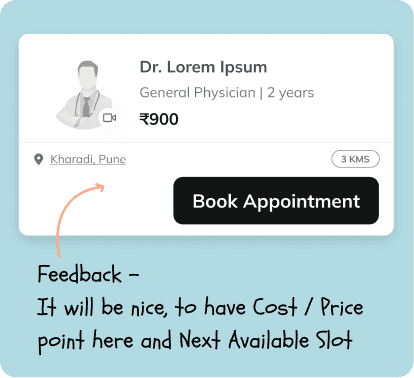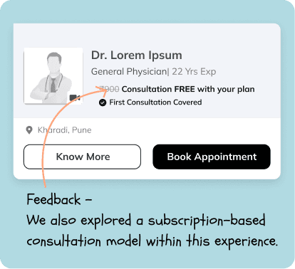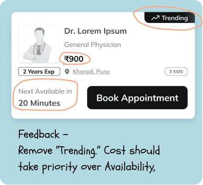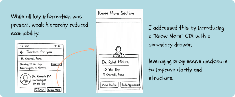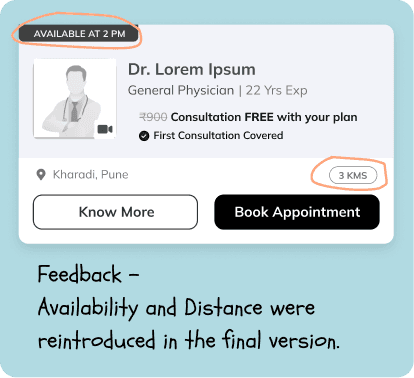 Hybrid Care Focus Research showed a need for both online and offline modes. We prioritized distance and ratings in the hierarchy, using the "Know More" drawer to provide trust signals without breaking the search flow.